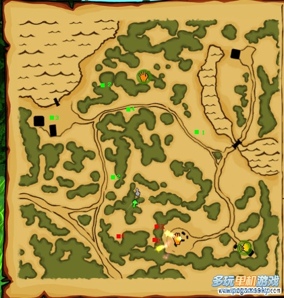 完成綠點4商人的任務后,他會帶你到紅點1左面的路邊,請你去全滅盜賊團,盜賊不會離開太遠,只要射下,逃跑,等盜賊回去時射他背后,就可以輕易全滅。