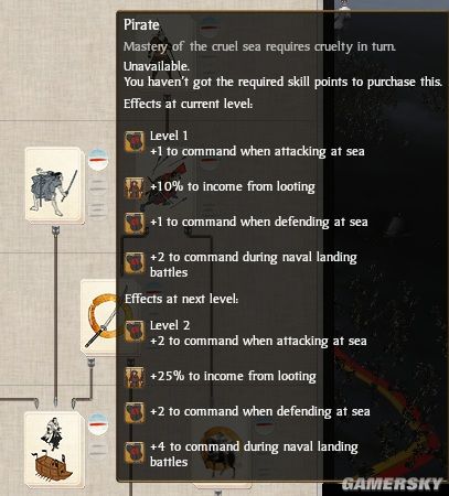 Lv.1:在海上攻擊時(shí),增加1點(diǎn)統(tǒng)率&打劫收入增加10%&增加“登艦戰(zhàn)斗”,2點(diǎn)統(tǒng)率