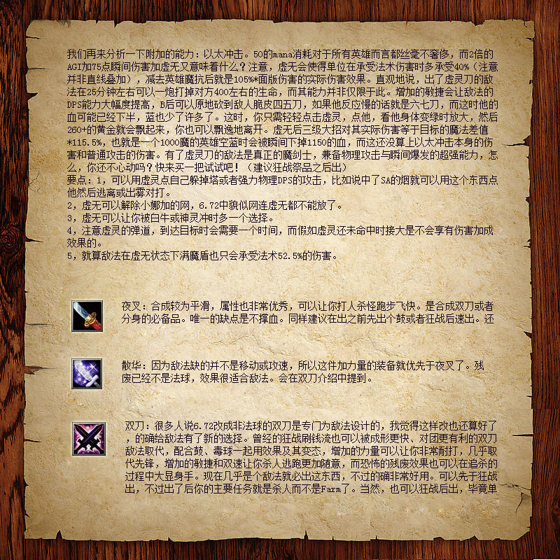 我們再來分析一下附加的能力:以太沖擊。50的mana消耗對于所有英雄而言都絲毫不奢侈,而2倍的AGI加75點瞬間傷害加虛無又意味著什么?注意,虛無會使得單位在承受法術傷害時多承受40%(注意并非直線疊加),減去英雄魔抗后就是105%*面版傷害的實際傷害效果。直觀地說,出了虛靈刀的敵法在25分鐘左右可以一炮打掉對方400左右的生命,而其能力并非僅限于此。增加的敏捷會讓敵法的DPS能力大幅度提高,B后可以原地砍到敵人脆皮四五刀,如果他反應慢的話就是六七刀,而這時他的血可能已經下半,藍也少了許多了。這時,你只需輕輕點擊虛靈,點他,看他身體變綠時放大,然后260+的黃金就會飄起來,你也可以飄逸地離開。虛無后三級大招對其實際傷害等于目標的魔法差值*115.5%,也就是一個1000魔的英雄空藍時會被瞬間下掉1150的血,而這還沒算上以太沖擊本身的傷害和普通攻擊的傷害。有了虛靈刀的敵法是真正的魔劍士,兼備物理攻擊與瞬間爆發的超強能力,怎么,你還不心動嗎?快來買一把試試吧。ńㄗh狂戰祭品之后出)