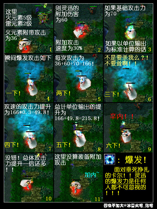 1:(火)攻擊力(20-80),同樣的,此時不要忘了火元素,與智力提升帶來的攻擊力,則附加攻擊為:(20+9+2=31、30+18+4=52、40+27+6=73、50+36+8=94、60+45+10=105、70+54+12=136、80+63+14=157),不算英雄自身成長所加智力的攻擊與雷元素所帶來的攻速提升,當火5級時就可以擁有100+的攻擊力,這已經是非常恐怖的了。