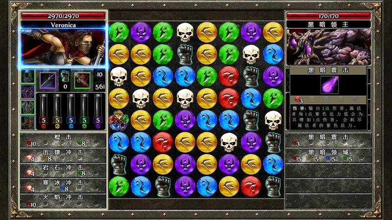黑暗領主血多而且技能也都非常厲害。黑暗震擊算是相當可怕的技能,隨意在消除寶石的時候一定要注意紅色魔法石和紫色魔法石,不要讓敵人輕易獲得