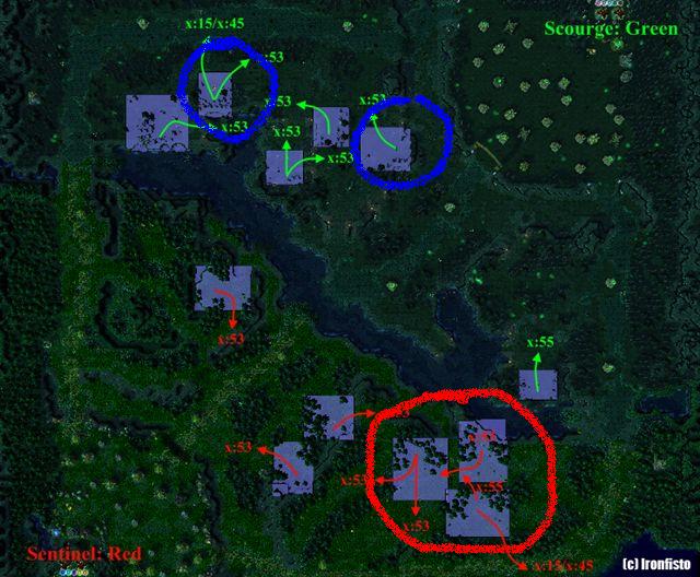 1級(jí)我們主要刷的野是紅色圈圈內(nèi)的3片野怪,其中最下面靠近兵線的1片野在實(shí)戰(zhàn)中經(jīng)常會(huì)被封掉,這里我們以最壞的打算假設(shè)它被封掉,因此我們只利用紅色圈圈內(nèi)左上的大野點(diǎn)和右邊靠近河道的野點(diǎn),2片野怪。