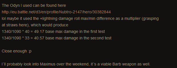 最近,暗黑3官網(wǎng)最著名的癡迷高手玩家Nubtro,做了一個數(shù)據(jù)測試,暗黑3的數(shù)據(jù)控玩家可以仔細(xì)揣摩了,他本人在武僧MVP Druin論壇的帖里面公布了對奧丁之子的傷害數(shù)據(jù)分析對比,得出了奧丁之子傷害計算數(shù)據(jù)。