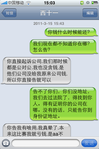 事情是這樣的,西十一他本人搞了一個什么玩途網絡科技有限公司,主要從事電子競技比賽項目,尤其是高校電子競技比賽。其實說到底就是打著舉辦高校電子競技比賽的名義賺錢,去年11月份到12月份的時候,西十一帶著ATS的項目策劃書找到我們在無錫的兄弟,說希望無錫的高校電子競技社團能配合他一起舉辦這屆的ATS聯賽,因為他是一個比較有名的dota解說,手里還拿著游戲客公司的公章,所以無錫的電競協會在他只預付了五千元的情況下,自己掏錢籌錢舉辦了這場比賽,結果這個比賽打完了,贊助商發現這個比賽根本沒有西十一承諾的那么大規模,很失望!AA平臺方面更直接,直接開除掉了負責本次比賽的負責人。可是他西十一卻跑路了,不但沒有把這個比賽的尾款給還上,還不停的還公司的地址,和各種拖延,從年前拖到年后拖到現在,他的意思基本上就是不想給了,無錫電競協會的人甚至去了他們公司昆山的所在地,結果發現竟然沒有這么一個公司。給他發短信他也是各種推辭,到后來干脆就是他們直接跟無錫方面的聯系人 換了手機號碼 無法找到人了!我這里有西十一你打的欠條和你的短信,你敢說這要是真的你視頻斷手么?