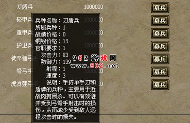 游戲中可供招募的兵種繁多,刀盾兵、輕甲兵、弩弓手、護衛兵……各類兵種的攻擊力、防御力、速度、射程都有所區別,屬性越高的兵種,招募價格相應越貴。如需招募實力強勁的兵種還有戰績和官職要求。如何以自己現有實力調配出最佳的武裝隊伍正是考驗玩家謀略計策的時候。