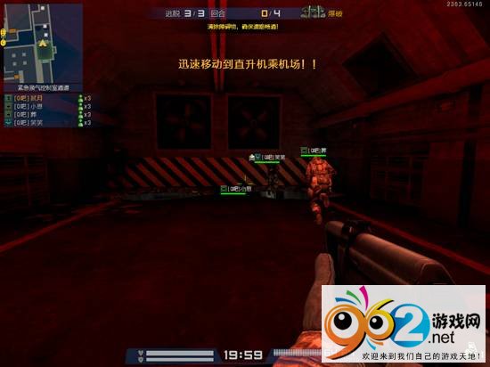 第四關,看到中間有個火箭筒的箱子了吧,1個人拿火箭筒,然后打開右邊或者左邊的門。看大家的習慣了。然后開門的人和拿火箭筒的人配合好門一開就發(fā)射,把這里的逃犯都吸引到這個門來,然后一個跑的快的隊友從另外個逃犯少的門速度沖進去爬上最里面的那個臺子也就是中間的爬上去一直挑釁那些逃犯(挑釁逃犯的時候一定要準星瞄準那個去飛機場的門的方向否則逃犯會爬上來的)。