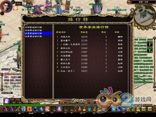 家族、幫會排行榜,分為本國和世界二種。家族排行榜以是貢獻度的多少來排名,幫會排行榜,是以繁榮度的多少來排名。做為家族成員,想要自己的家族能上世界排行榜,就需要家族里每個人多做任務,多為家族增加貢獻度。幫會想要強大,上世界幫會排行榜,需要多收家族,讓幫會繁度更多。