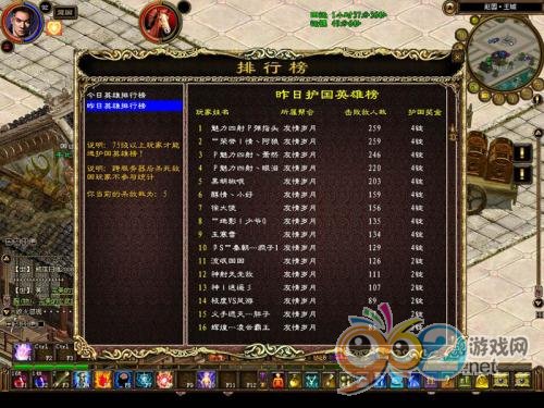 有入侵,就有反抗。當敵國的人入侵本國時,殺敵,不但可以上電視,保家衛國的英雄們,還能上國家英雄排行榜。國家英雄排行榜,按當天擊敗敵人人數的多少,排出前二十名,殺敵排行前十名者,將獲得4錠銀子的獎勵。11到20名,可獲得2錠銀子。通過查看英雄排行榜,可以知道,本國哪些人是殺敵高手,而讓上榜的人也了解自己的排名情況,若自己排行是11名,就要再加油,沖進前十名,多得2錠銀子。75級以上的玩家才能上英雄榜。