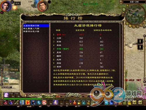 國家綜合實力榜,分為太廟資源排行榜、國王募集人氣榜、國家綜合實力榜。太廟資源排行榜是每個人每天都要查閱的。因為太廟資源隨時都在變化,若太廟資源到0時,將不能搬磚,或者搬了磚在身上,交的時候如果那國的磚塊資源為0時,交時就少了一半經驗。如果某個國家的磚當天累積到1000塊以上,就會顯示紅色,去紅色字體的國家搬磚,磚塊經驗將增加1.5倍;每天有個國家的磚塊被保護,該國的磚頭將不能搬,在榜上顯示為綠色,這樣大家看到榜,就不會白跑一趟。而藍色字體顯示的國家的磚數,是前一天磚塊資源第一的國家,這個國家的磚塊,當天不受時間限制,24小時內都可以搬。太廟搬磚有這么多的講究,所以搬磚時要密切關注太廟排行榜的動向。