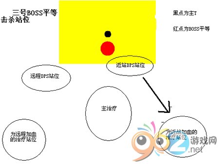 開打分為三個方向,和尚跟主治療在同一隊伍,站在正中間;遠程DPS與輔治療站在Boss的左邊;近戰DPS與治療站在Boss的右邊;左右兩邊采取治療與DPS距離20尺,DPS與Boss距離20尺的擊殺方式。
