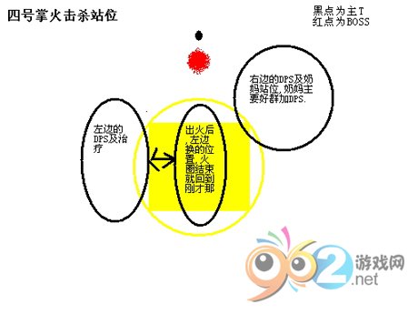 4號Boss掌火:這個Boss為半跑動半站樁式打法(至少現在是這樣擊殺),首先和尚主T,從Boss背后拉Boss,Boss的左后方站6位玩家,右后方站18位玩家。左邊的玩家踩好扶搖,Boss會給左邊6位玩家其中五位仍一個火圈,火圈出現之前會爆炸一下,傷害大概在4000左右。中了火圈的立刻起跳至中間(Boss正后方),沒踩好扶搖的,也可以躡云至中間。這個Boss有一個全體DOT,每秒傷害90左右,可疊加10重。所以現在是考驗DPS的效率及奶媽的治療能力的時刻。主T注意扶搖躲避佛西歸就好,另外此Boss有一自身增益,不可驅散,但讀條可打斷,萬花注意厥明指打斷即可。