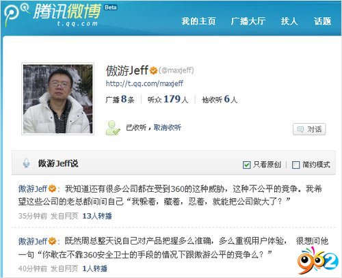 就在三方酣戰(zhàn)的同時,傲游終于打破沉默,也加入了這場混戰(zhàn)。市場份額被360瀏覽器超越的傲游CEO陳明杰(http://t.qq.com/maxjeff)指出,周鴻祎整天說自己對產(chǎn)品把握多么準確,多么重視用戶體驗,很想問他一句你敢在不靠360安全衛(wèi)士的手段的情況下跟傲游公平的競爭么?
