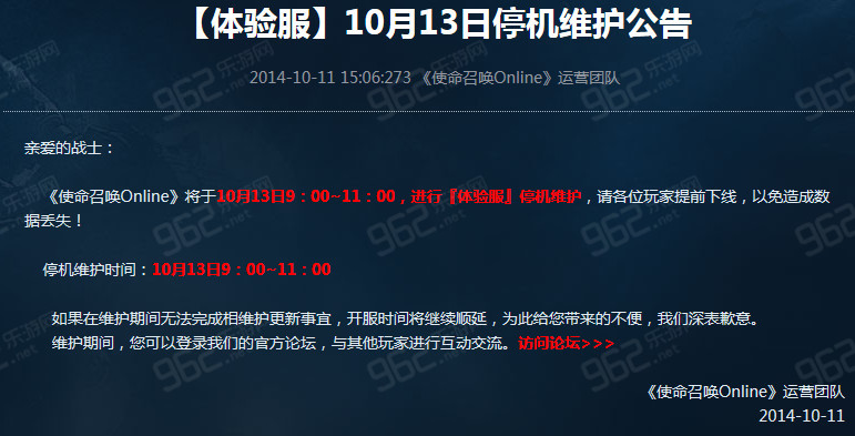 《使命召喚Online》將于10月13日9:00~11:00,進行『體驗服』停機維護,請各位玩家提前下線,以免造成數據丟失!