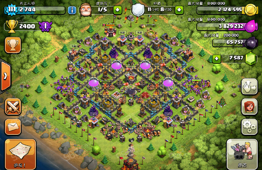 ③雙王內(nèi)置.能力自不必說(shuō),而且就像我上面說(shuō)的那樣,王在里面的,進(jìn)攻方的軍隊(duì)就會(huì)優(yōu)先敲墻去打王,后果不堪設(shè)想.一般farm的,看到雙王內(nèi)置,基本就沒(méi)欲望打了.再加上2個(gè)地獄塔,資源不誘惑人的話根本沒(méi)人碰你.