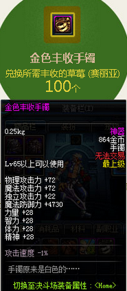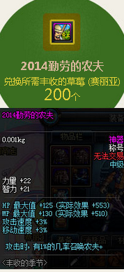 在賽麗亞房間的NPC勤勞的農夫處可以利用豐收的草莓 (賽麗亞)兌換首飾:銀色豐收手鐲&金色豐收手鐲以及稱號:2014勤勞的農夫。