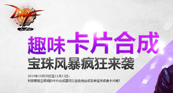 [樂游網導讀]DNF趣味卡片合成是在10月30日進行維護更新后上線的活動,玩家可以通過賽利亞那里的卡片合成器隨意合成寶珠和卡片,下面就跟小編一起來看看具體的活動內容吧!