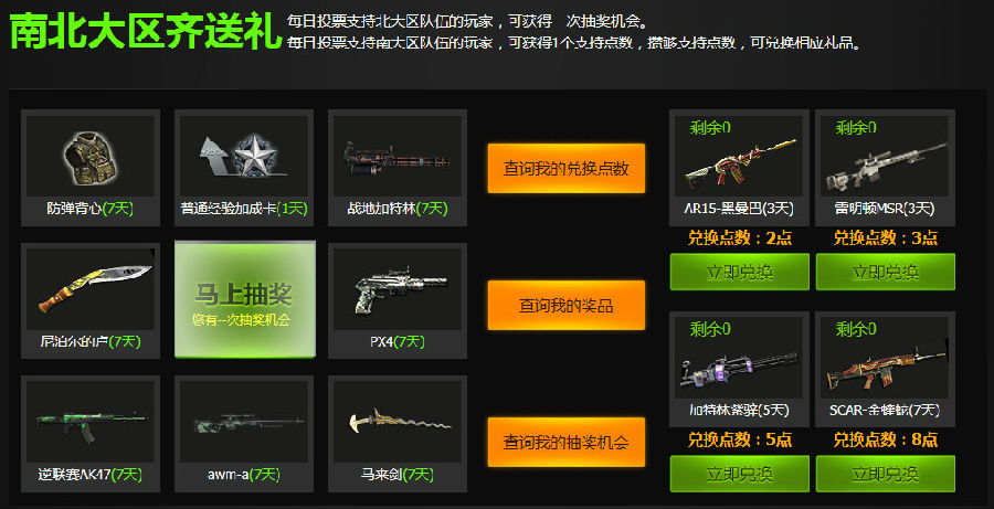 2、投票支持北大區的玩家,可以獲得1次抽獎機會,投票支持南大區的玩家可以獲得1個支持點數,攢夠支持點數可以兌換相應獎品。ㄏ蘖浚