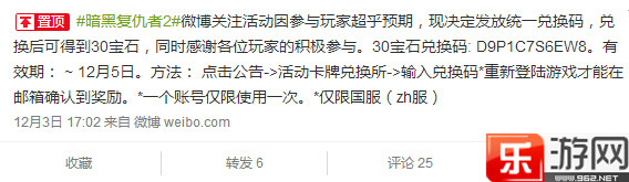 [樂游網導讀]今天暗黑復仇者2在微博更新了寶石的兌換碼,但是沒有關注官方微博的玩家們可能還不知道這個兌換碼,下面小編就為大家分享下30寶石的兌換碼,玩家們趕緊去兌換吧!