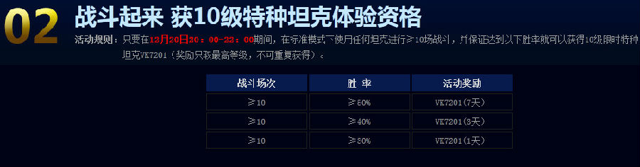 活動規則:只要在12月20日20:00-22:00期間,在標準模式下使用任何坦克進行≥10場戰斗,并保證達到以下勝率就可以獲得10級限時特種坦克VK7201(獎勵只取最高等級,不可重復獲得)。
