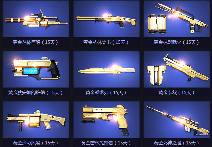 購買1次, 必得1把武器、藍鉆貴族和黃金福袋,黃金福袋可兌換任意黃金武器