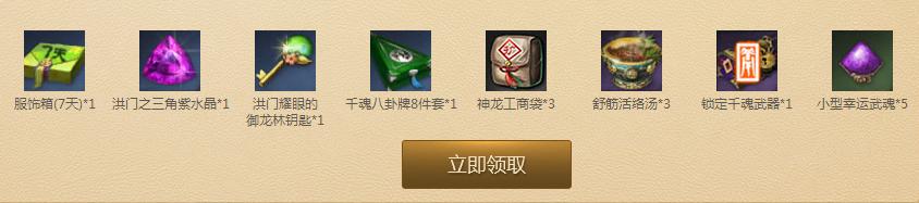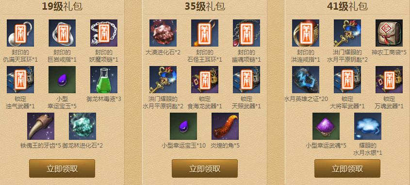 19級禮包:1月22日起在電信盛世區(qū)、網(wǎng)通開泰區(qū)新注冊游戲角色的玩家,新注冊角色等級達到19、35、41級后可以領取相應的升級禮包一份,單Q限領一份