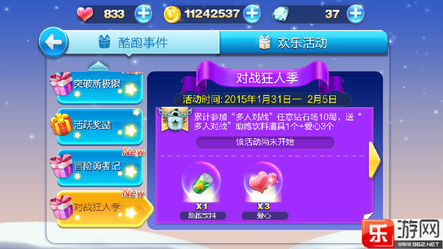 1、累計參加“多人對戰(zhàn)”任意鉆石場10局,送“多人對戰(zhàn)”助跑飲料道具1個+愛心3個;