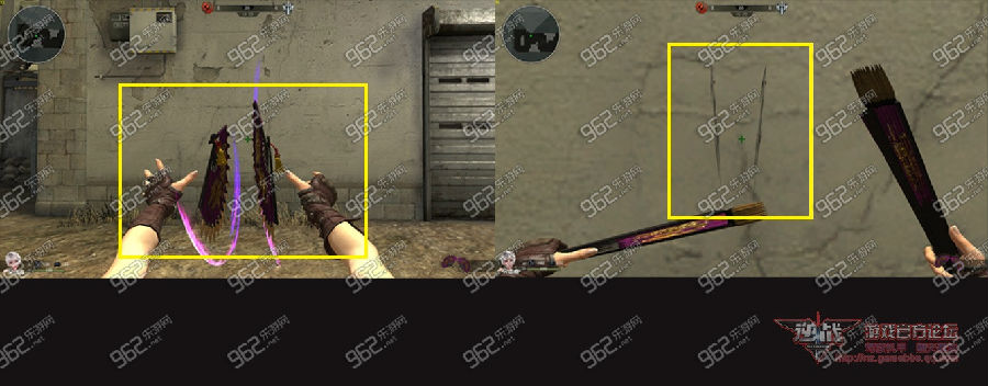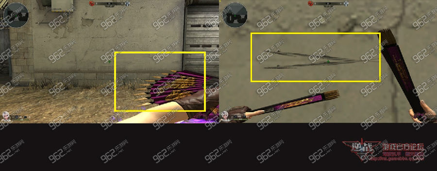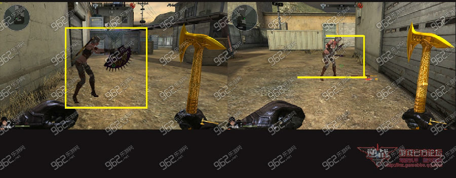 上圖為蝶衣雙扇第三人稱下重刀的出刀方式以及蝶衣雙扇的攻擊范圍草圖演示,大家可以注意上圖右邊小圖的黃色線條,由人的手臂到豎向的黃線條就是蝶衣雙扇的攻擊范圍喲。好了,最后我們來看看傷害測試簡圖。