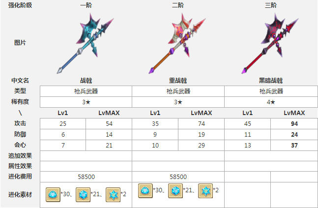 白貓計劃中角色與武器都非常豐富,而除了強大的4星武器之外,3星武器在合理的強化之后也十分給力,今天給大家介紹3星槍兵武器‘戰戟’的詳細屬性以及進階所需材料!