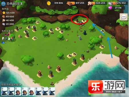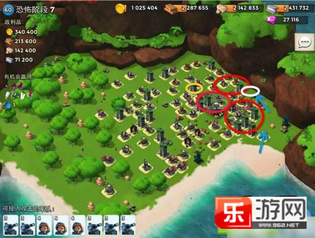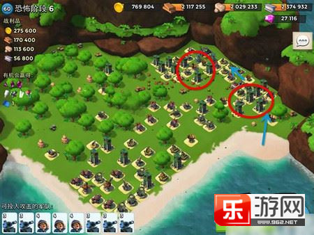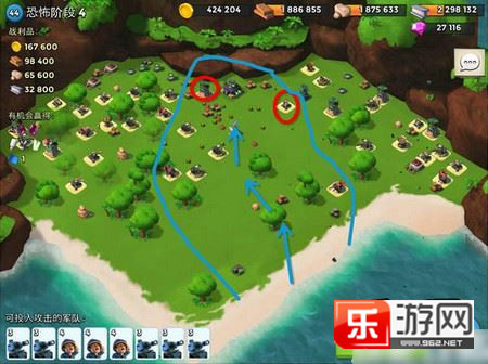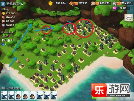 能量不多的玩家可在中間登陸(或右路在靠墻走)收取能量先炸掉小紅圈內的巨加狙擊塔、鎮暴炮擊炮,在大紅圈巨加射程內冰鎮大片防御摧毀,最后在右路靠墻處收本