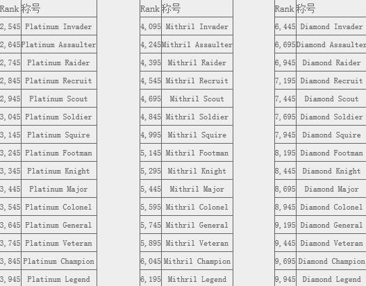 首先來看看戰場等級對應的戰場稱號吧!刷子們,Diamond Legend稱號在等著你!下面是每次升級所需要的戰場經驗,到了5級之后經驗就固定在5000了。