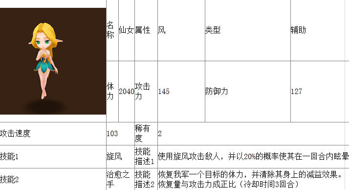 仙女總體定位來講屬于輔助,旋風(fēng)技能造成傷害的同時(shí)能有20%的概率使敵人眩暈,有一定的控制效果,治愈之手能夠恢復(fù)單體友軍的體力,并移除其身上所帶的debuff效果,并且恢復(fù)量與攻擊力成正比,那么這個(gè)技能就適合于給己方Dps加。總體來講輔助效果還是不錯(cuò)的。