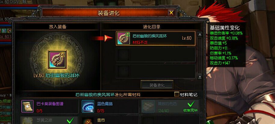 (圖為后街幽狼的耳環(huán)第一次升級后提升的屬性變化)