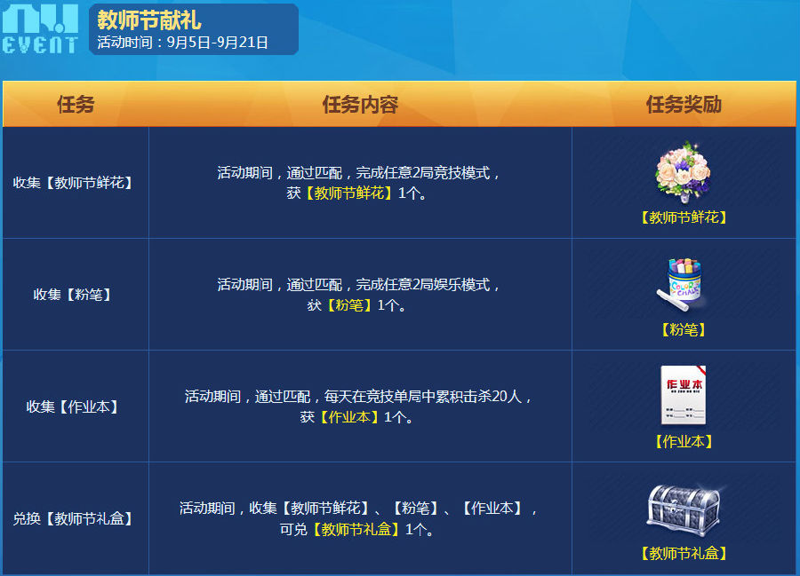 打開【教師節禮盒】,有幾率獲得商城熱賣武器及教師節專屬道具