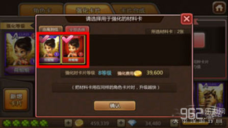 選擇材料卡的界面會顯示強化時卡片能達到的等級,當升級到最高等級時顯示MAX,且不能再進行升級。
