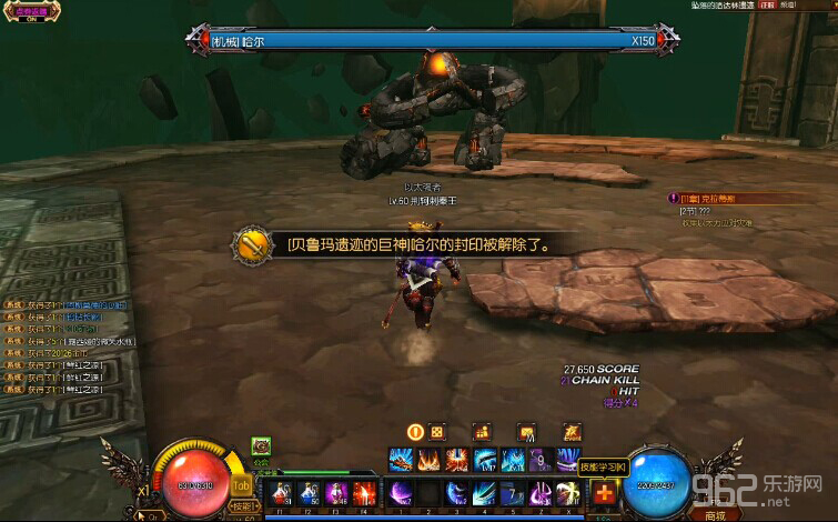 6.好的,進入BOSS區域,可以看到左右兩個各有個躺著的石頭人BOSS,左邊的叫達林,右邊的叫哈爾!要把哈爾打到一定血量,然后哈爾會無敵躺下,啟動左邊的達林!當達林也到達一定血量的時候,就會同時啟動兩個石頭人哈爾和達林!