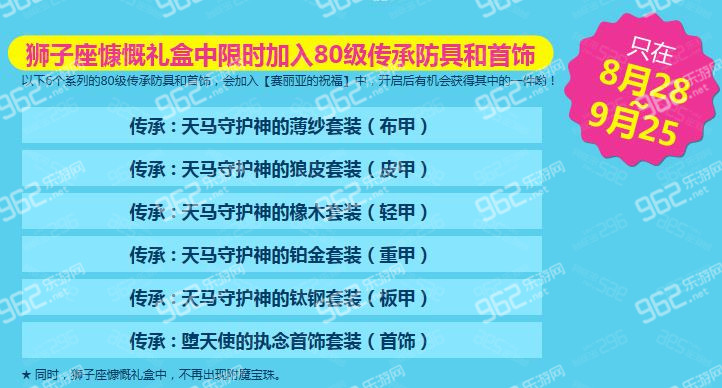 獅子座慷慨禮盒加入六個系列80級傳承防具和首飾,開啟即可獲得一件。