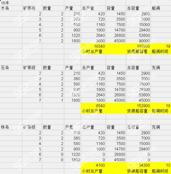 [樂游網導讀]終于弄出來了,[鐵船裝滿的時間]=[所有鐵島上鐵礦容量之和]/[鐵島每小時總產量],根據上次的結論做的,歡迎驗證。