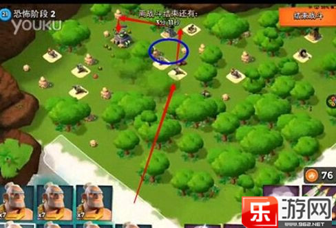 最主要使用煙霧彈掩護野人。〖t色箭頭為進攻路線,沿進攻路線自行丟煙霧彈;綠圈區域提前使用丟多管火箭炮或導彈炸掉,主要是炸掉地雷或者炸箱子獲取能量;藍圈區域丟震爆彈,之后就是直推司令部。